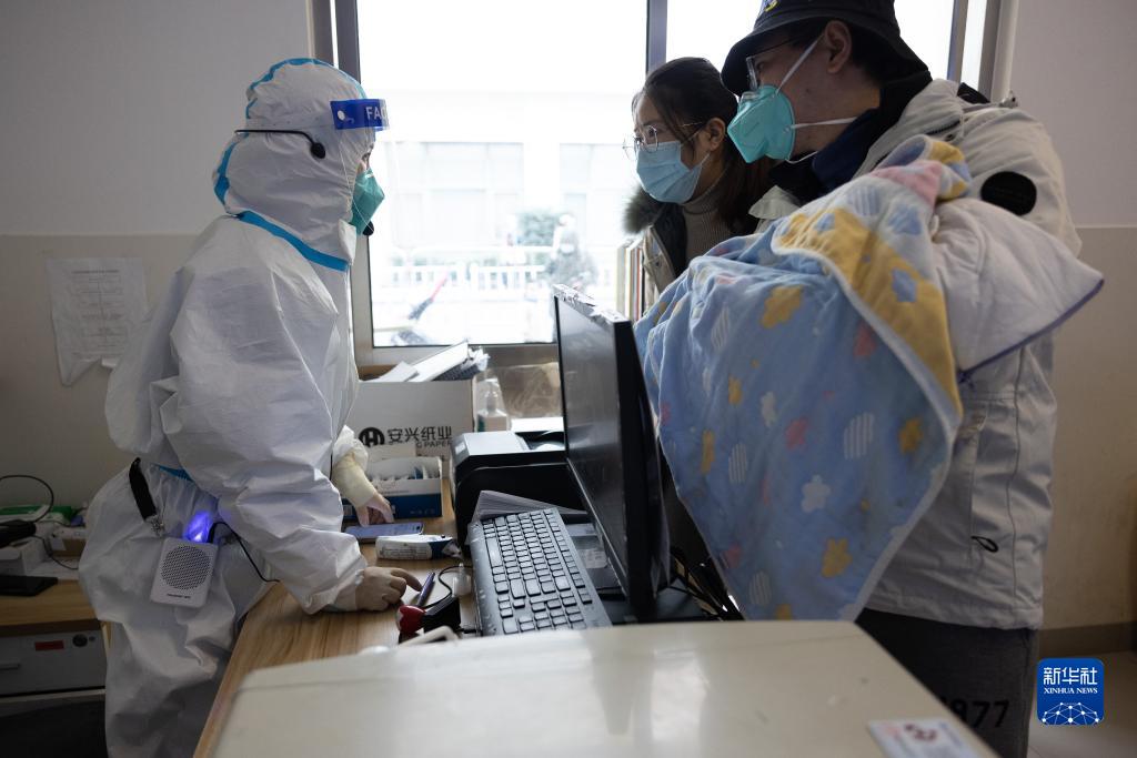 12月27日,在上海交通大學醫學院附屬新華醫院兒科發熱門診預檢臺前,護士回答家長提問。