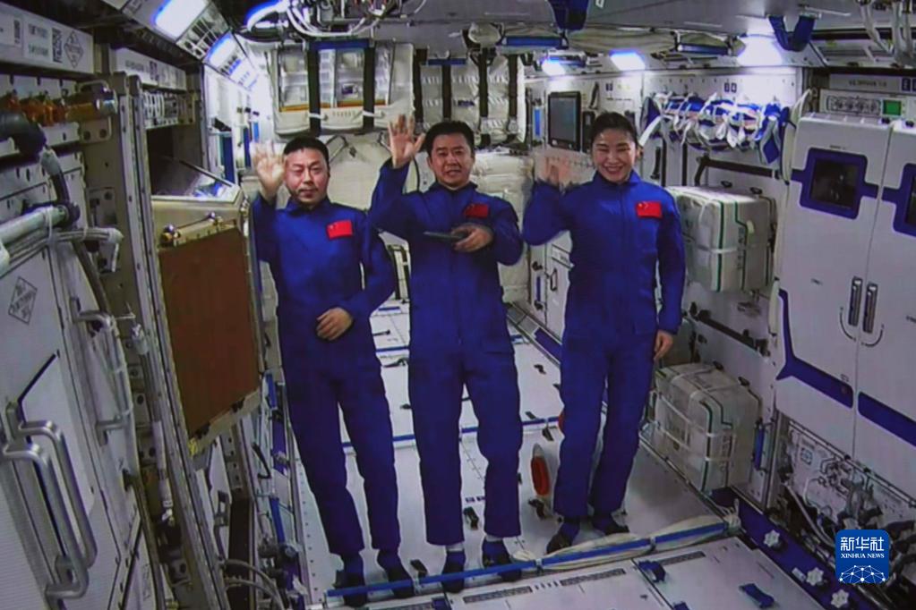 7月25日在北京航天飛行控制中心拍攝的神舟十四號航天員陳冬(中)、劉洋(右)、蔡旭哲進入問天實驗艙。神舟十四號航天員乘組于7月25日10時03分成功開啟問天實驗艙艙門,順利進入問天實驗艙。這是中國航天員首次在軌進入科學實驗艙?!⌒氯A社記者 郭中正 攝