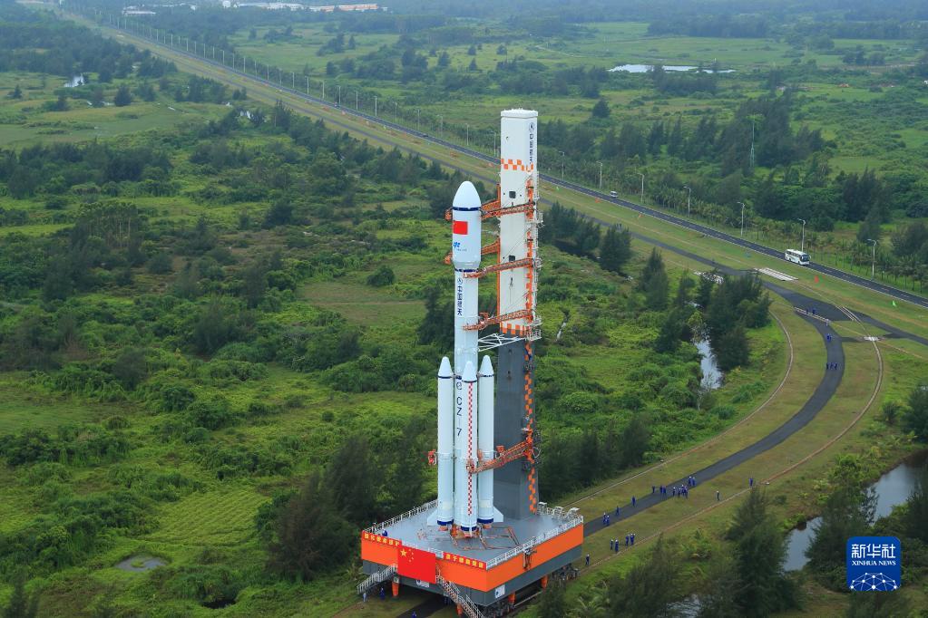 5月7日,天舟四號貨運飛船與長征七號遙五運載火箭組合體在垂直轉運?!⌒氯A社發(楊志遠 攝)