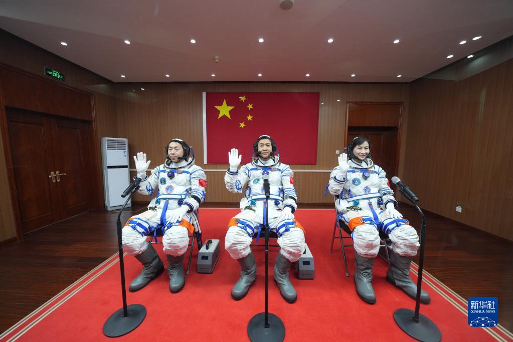 6月5日,神舟十四號載人飛行任務航天員乘組出征儀式在酒泉衛星發射中心舉行。陳冬(中)、劉洋(右)、蔡旭哲即將開啟為期6個月的飛行任務?!⌒氯A社記者 李剛 攝