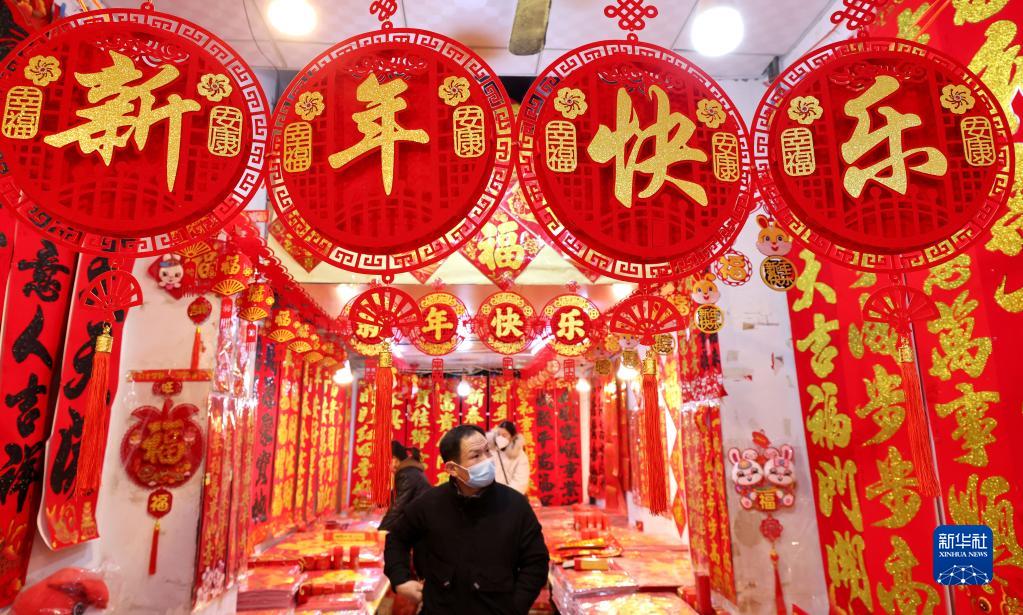 元旦、春節臨近,人們紛紛選購花卉、瓜果、春聯等年貨,迎接佳節。