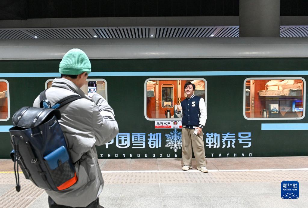 12月28日,在烏魯木齊站,旅客在Y965次“中國雪都·阿勒泰號”冰雪游旅客列車旁拍照留念。