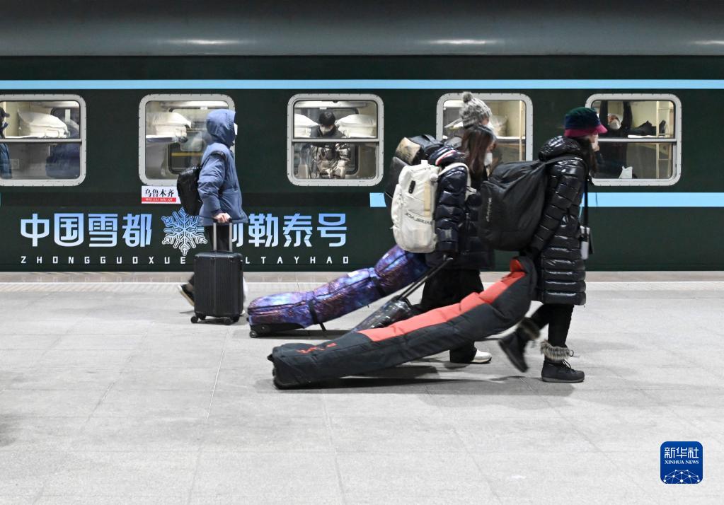 12月28日,在烏魯木齊站,旅客從Y965次“中國雪都·阿勒泰號”冰雪游旅客列車旁走過。