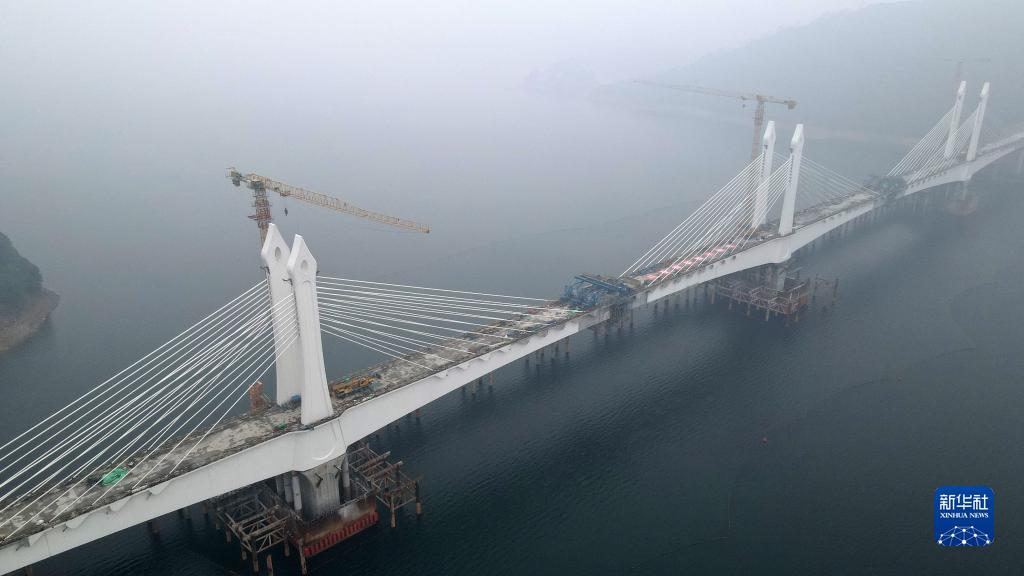 這是合龍后的中國鐵建大橋局池黃鐵路太平湖特大橋(12月29日攝,無人機照片)。