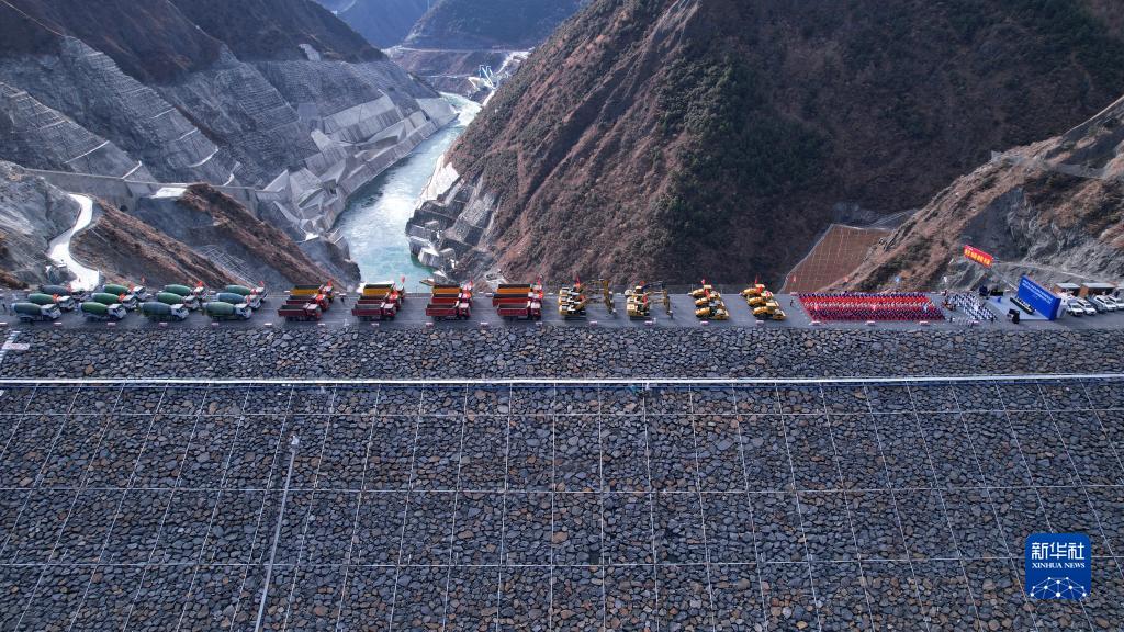 12月29日,雅礱江兩河口混合式抽水蓄能電站開工儀式在四川雅江兩河口水電站大壩上舉行(無人機照片)。