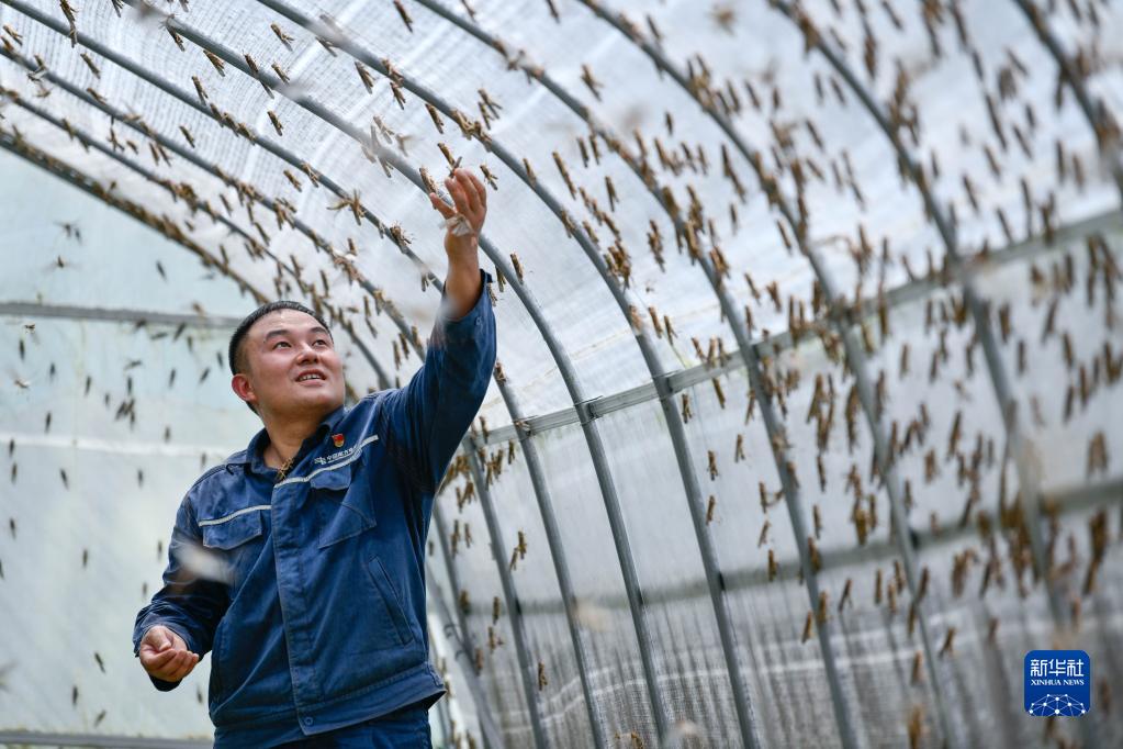 劉開福在村里查看大棚養殖的螞蚱生長情況(2022年8月3日攝)。