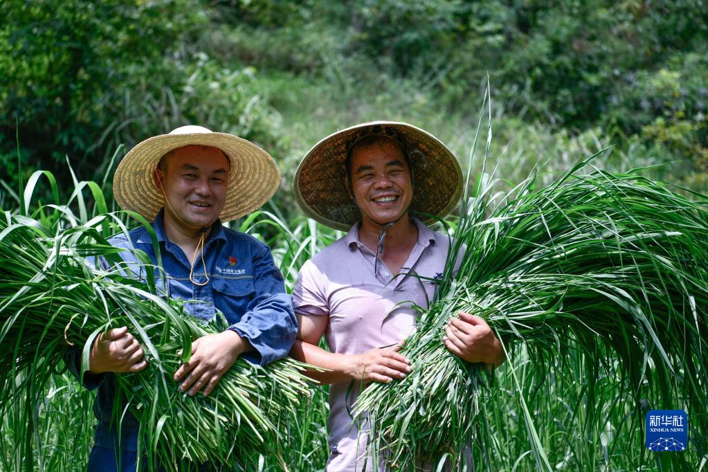 劉開福(左)與村民收割投喂螞蚱所需的草料(2022年8月3日攝)。