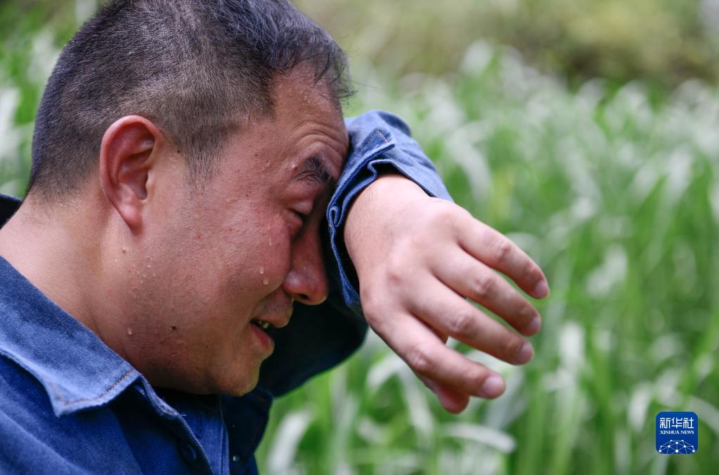 劉開福收割投喂螞蚱所需的草料時擦拭汗水(2022年8月3日攝)。