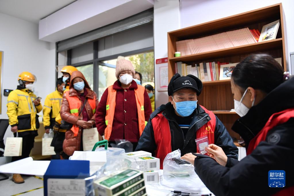 12月29日,在長沙市天心區文源街道天鴻社區的“紅色之家”,環衛工人、外賣騎手排隊領取藥品。