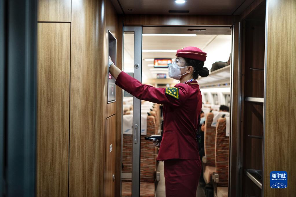 12月30日,由唐山開往北京的G8802次列車乘務員在列車上工作。