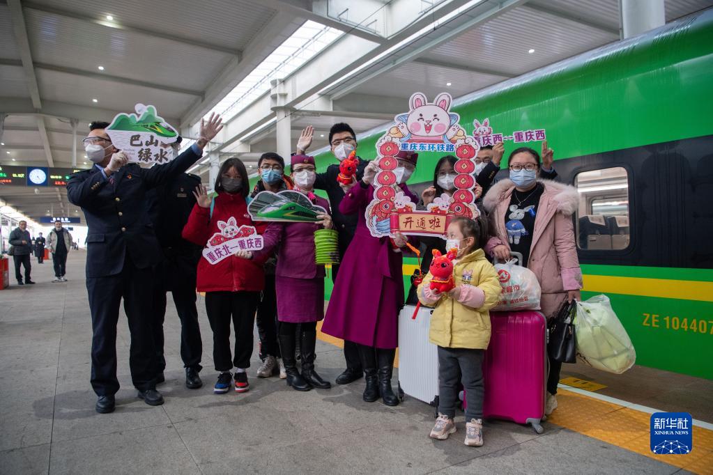 12月30日,搭乘首趟重慶東環鐵路列車的旅客和鐵路工作人員在重慶北站合影。