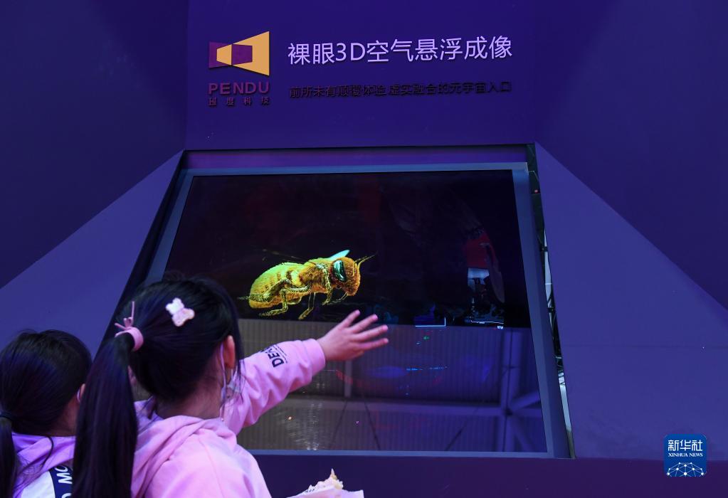 12月29日,參觀者在第十八屆文博會上體驗裸眼3D空氣懸浮成像。