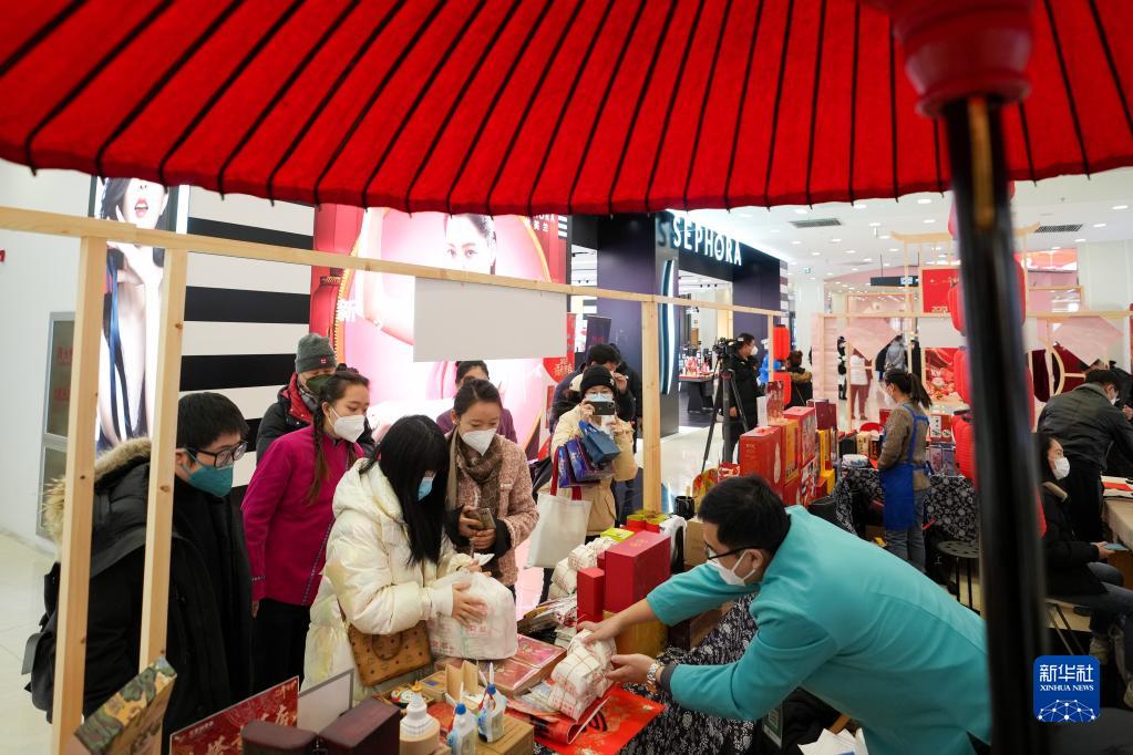 12月30日,在北京年貨節啟動活動的年貨市集區,顧客在購買年貨商品。