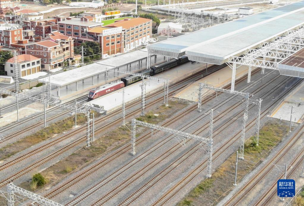 12月30日,在福建泉州站,T8010次列車啟程(無人機照片)。