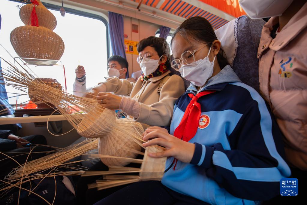 12月30日,在T8010次列車上,福建省泉州市安溪縣竹編大師陳紅萍(左二)帶旅客體驗竹編技藝。