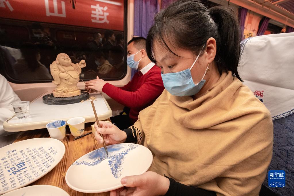 12月30日,在T8010次列車上,福建省泉州市德化縣的陶瓷手繪藝人向旅客展示陶瓷繪畫技藝。