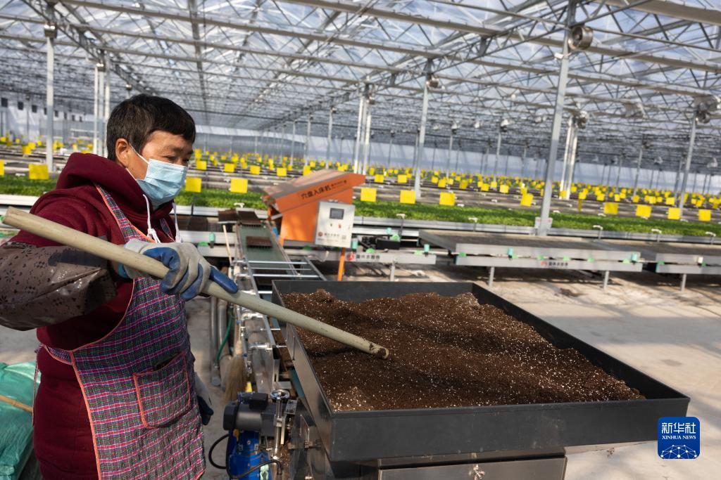 在上海浦東新區宣橋鎮腰路村的清美數字化蔬菜基地,60歲的張新菊負責把通過自動播種機的格柵歸攏(12月7日攝)。