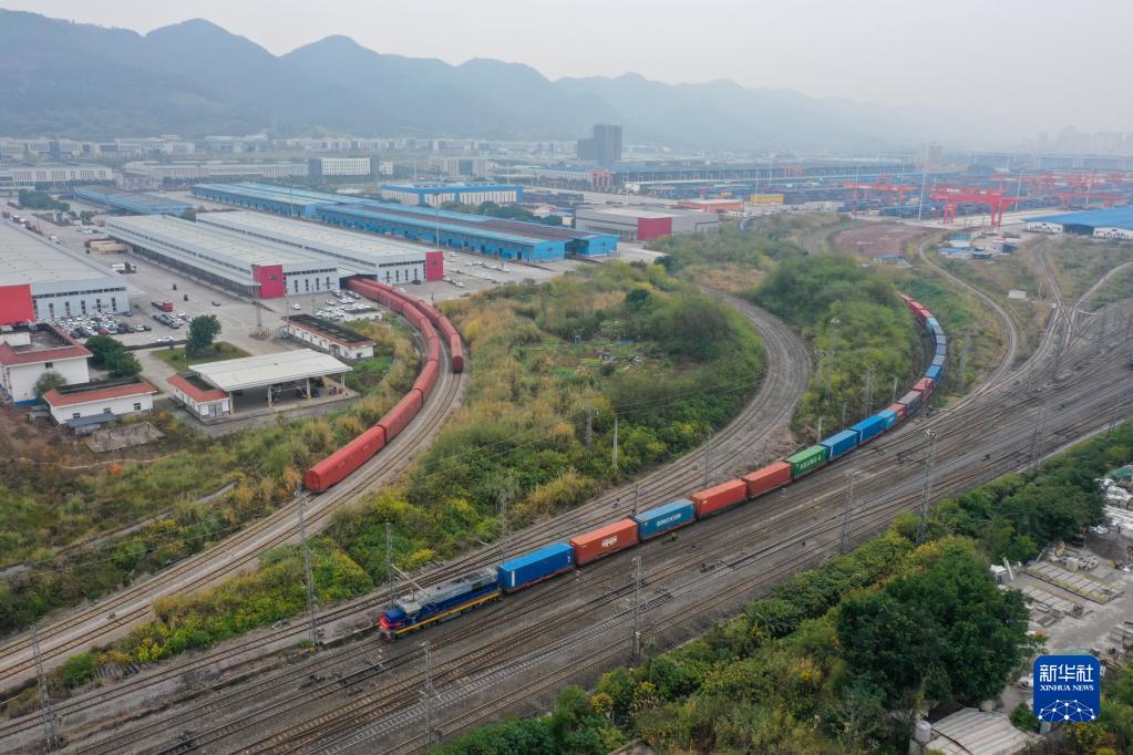 12月30日,西部陸海新通道鐵海聯運班列在重慶團結村中心站順利發車(無人機照片)。