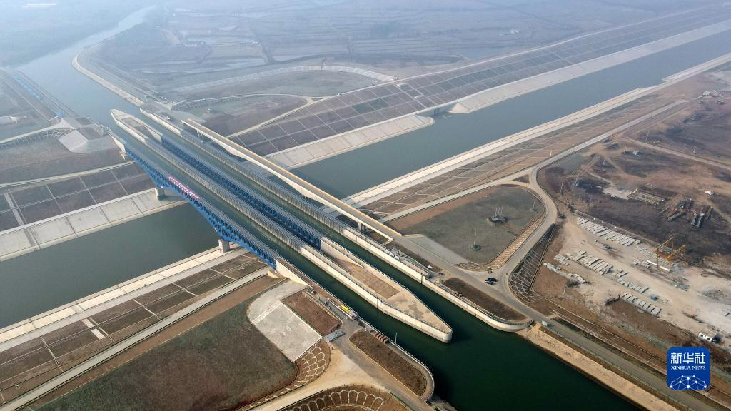 12月30日,中鐵四局參建的引江濟淮淠河總干渠渡槽通航(無人機照片)。淠河總干渠從引江濟淮運河上凌空而過,呈現出河上有河的“水上立交”景象。