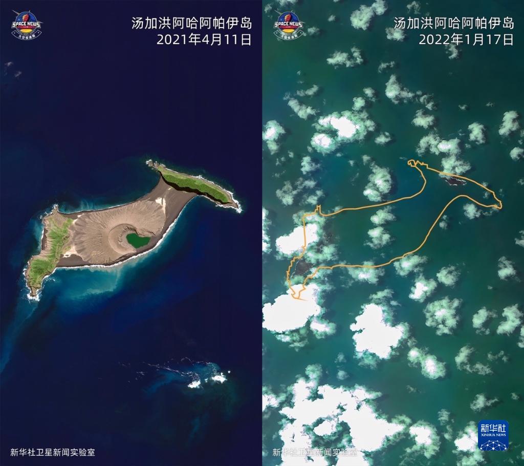 2021年4月11日Worldview02衛星拍攝的湯加洪阿哈阿帕伊島衛星圖片(左)和2022年1月17日“高分一號”衛星拍攝的該島火山噴發后的衛星圖片,橘色曲線為按照地理坐標標注出的島嶼原先輪廓(拼版照片)。新華社發(新華社衛星新聞實驗室供圖)