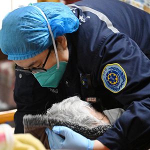 急救醫生謝艷杰在病人家中抱起病人(12月29日攝)。
