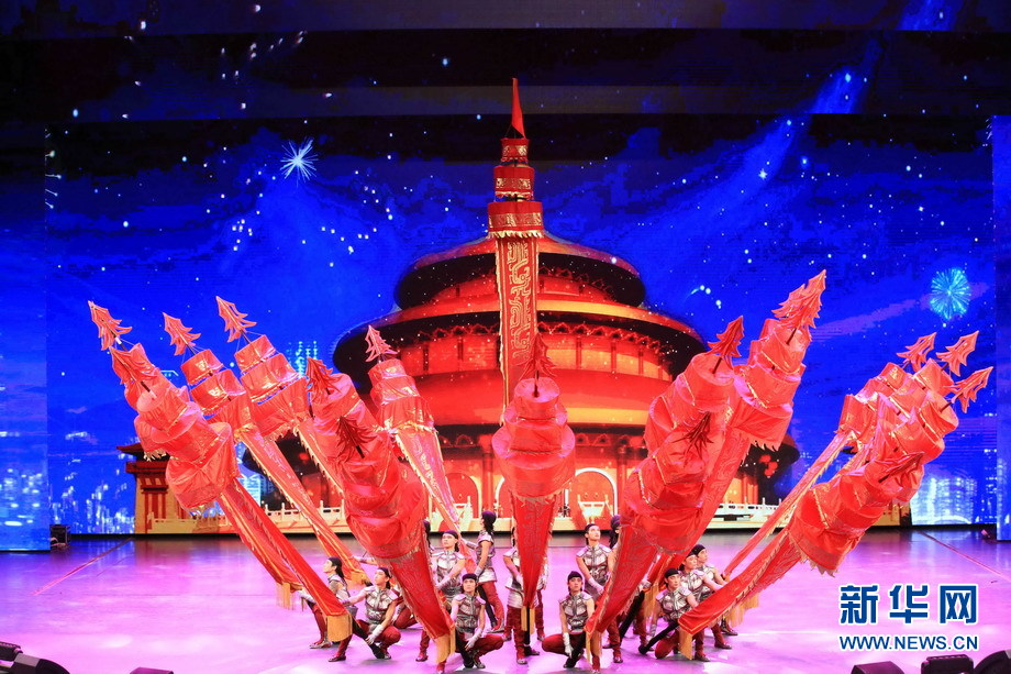 滄州雜技演員表演榮獲中國雜技金菊獎的雜技節目《龍躍神州——中幡》。新華網發( 劉文忠 攝)