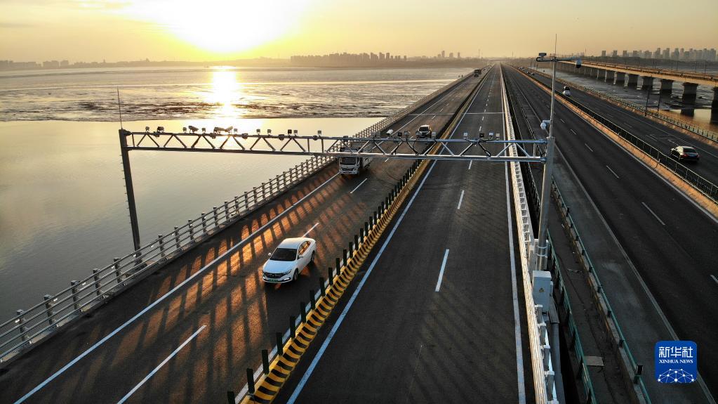 這是12月30日拍攝的建成通車的青蘭高速公路改擴建工程女姑口跨海特大橋(無人機照片)。新華社記者 李紫恒 攝