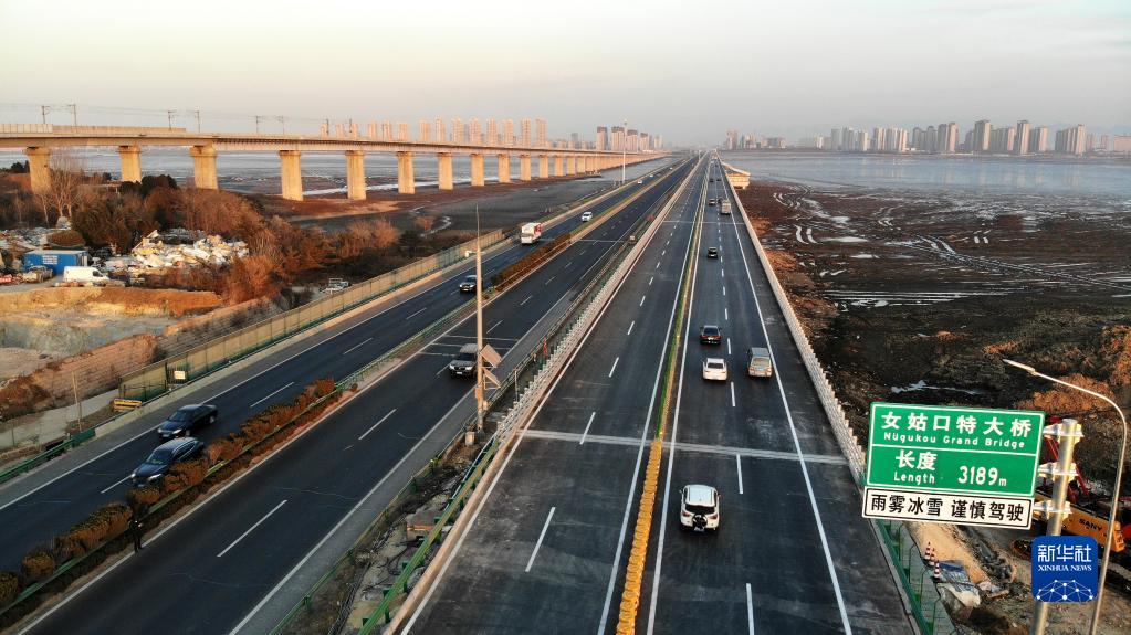 這是12月30日拍攝的建成通車的青蘭高速公路改擴建工程女姑口跨海特大橋(無人機照片)。新華社記者 李紫恒 攝