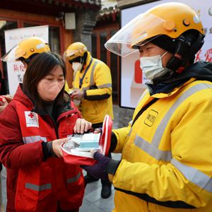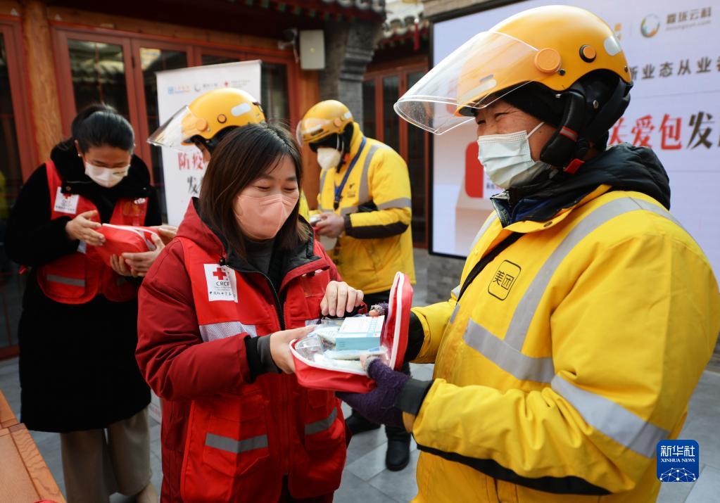 當日,中國紅十字基金會聯合愛心企業發起“匯思霖瓏新業態從業者關愛行動”,向北京的快遞、外賣人員等免費發放2000只“防疫關愛包”,在新年來臨之際為他們送去關愛和健康。新華社記者 劉勇貞 攝