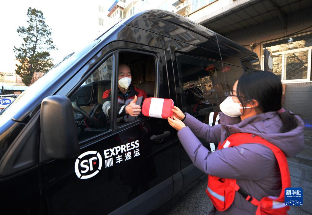 12月30日,在北京順豐速運有限公司大方家業務部,中國紅十字基金會工作人員為快遞人員送上“防疫關愛包”。新華社記者 劉勇貞 攝