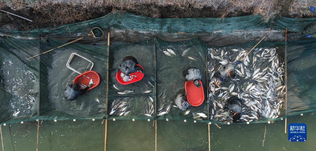12月30日,江蘇淮安市淮安區流均鎮養殖戶在魚塘冬捕(無人機照片)。新華社發(趙啟瑞 攝)