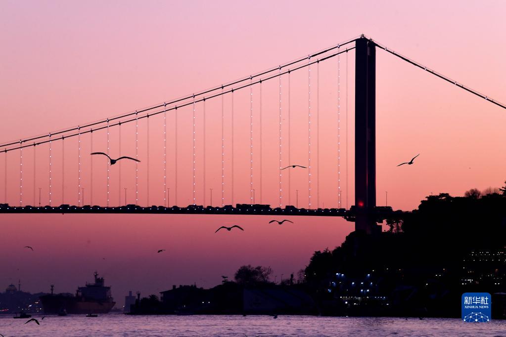 這是12月22日傍晚拍攝的土耳其伊斯坦布爾博斯普魯斯海峽風光。
