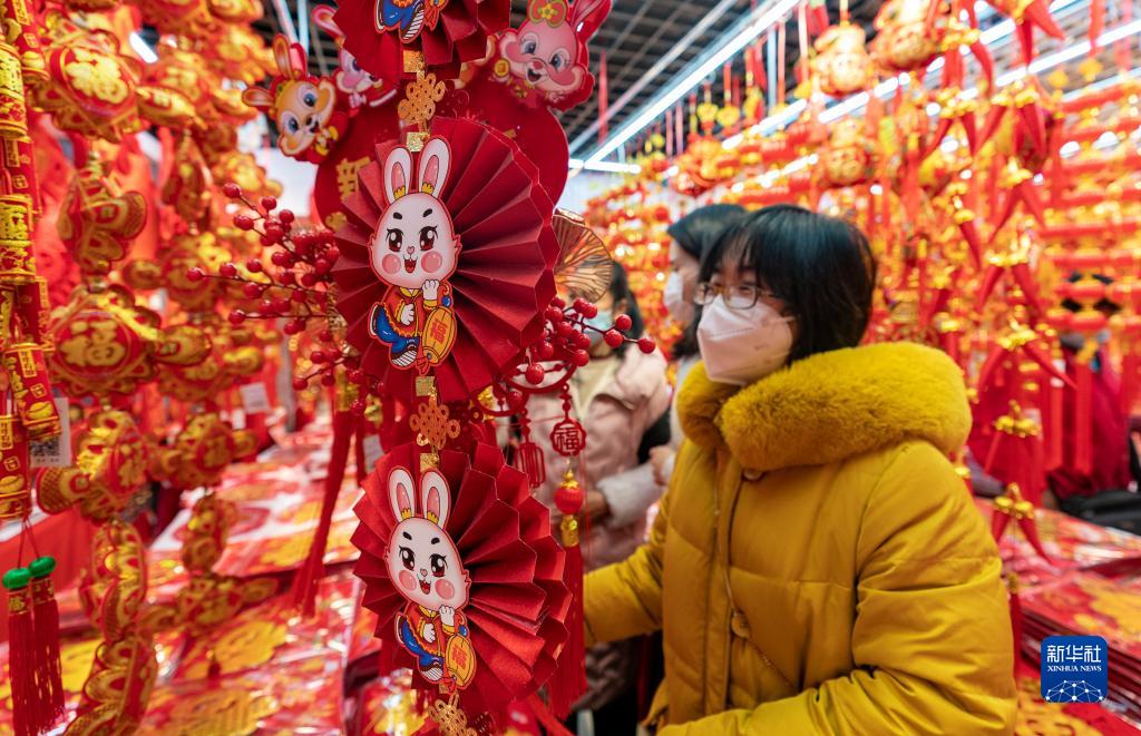 近期,位于云南省昆明市的新螺螄灣國際商貿城內節日飾品購銷兩旺,紅燈籠、春聯、兔年生肖飾品等銷售逐漸升溫。