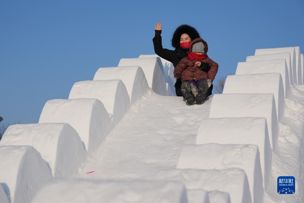 12月31日,游客在第35屆哈爾濱太陽島國際雪雕藝術博覽會園區內玩滑梯。