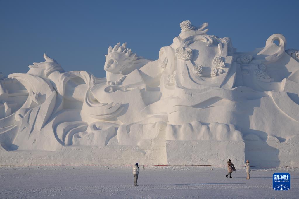 當日,許多市民和游客來到第35屆哈爾濱太陽島國際雪雕藝術博覽會園區游玩,歡度元旦假期。