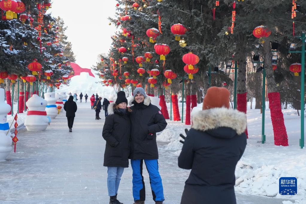 當日,許多市民和游客來到第35屆哈爾濱太陽島國際雪雕藝術博覽會園區游玩,歡度元旦假期。
