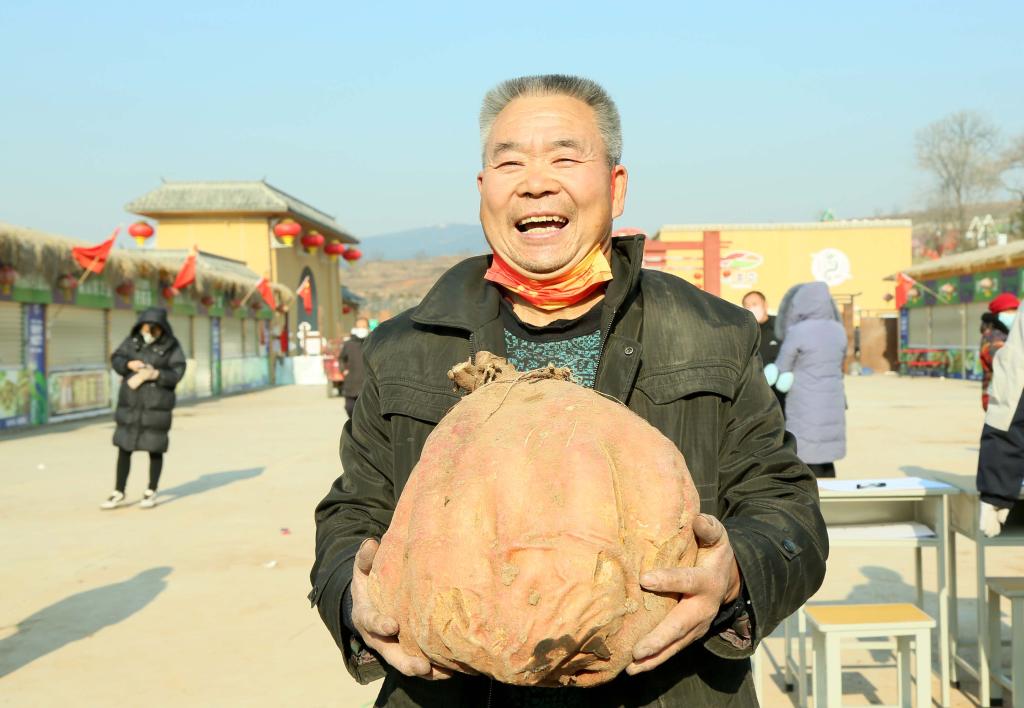 12月30日,在汝陽紅薯擂臺賽上,農民展示參賽的紅薯。