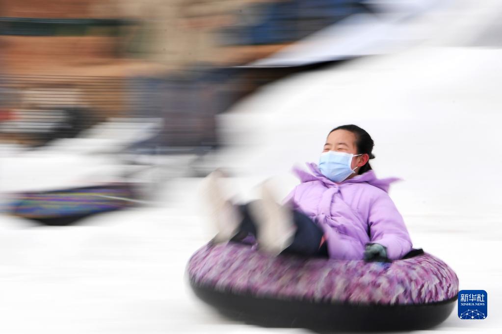 12月25日,在蘭州市北山林場,小朋友在冰雪嘉年華上體驗雪地娛樂項目。