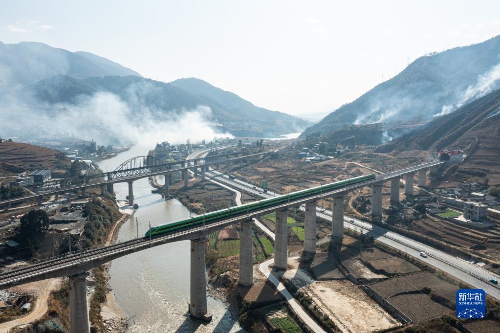 12月26日, C45次列車行駛在新成昆鐵路上(無人機照片)。