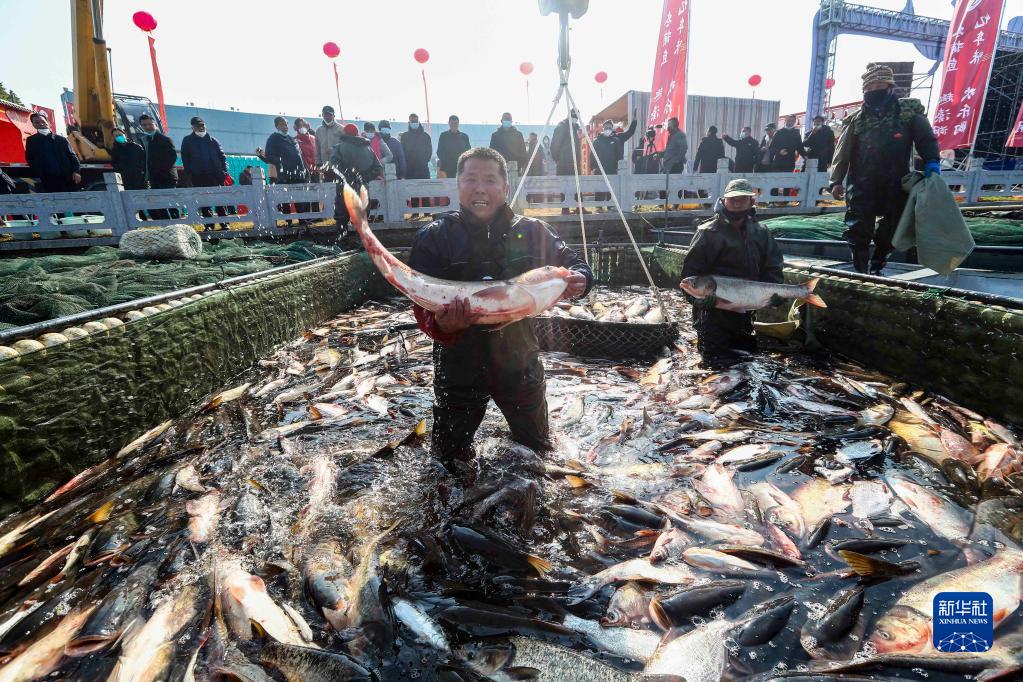 新年臨近,江蘇省泰州市姜堰區溱湖6000多畝水域進入冬季捕魚季,漁民們抓緊捕撈供應節日市場。