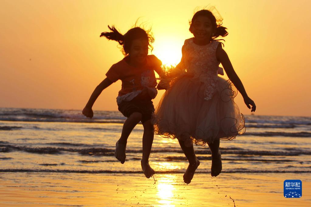 2022年12月31日,孩子們在巴基斯坦卡拉奇海邊的夕陽下玩耍。