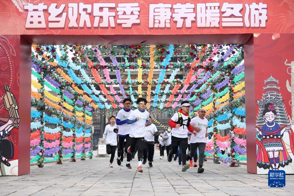 1月1日,跑步愛好者在貴州省黔東南苗族侗族自治州丹寨縣萬達小鎮參加迎新年健康跑活動。