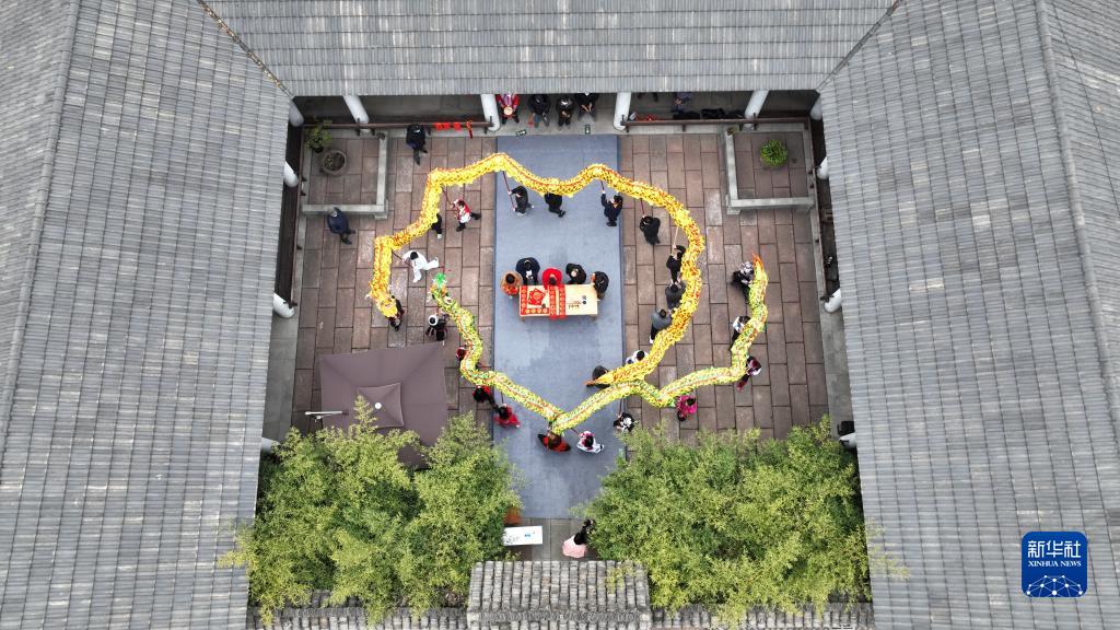 1月1日,在浙江省湖州市德清縣阜溪街道興山社區居家養老服務中心,少數民族群眾在舞龍(無人機照片)。