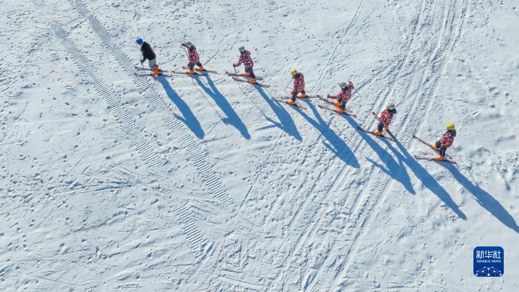 2022年12月31日,滑雪愛好者在河北省遵化市一家滑雪場練習滑雪(無人機照片)。