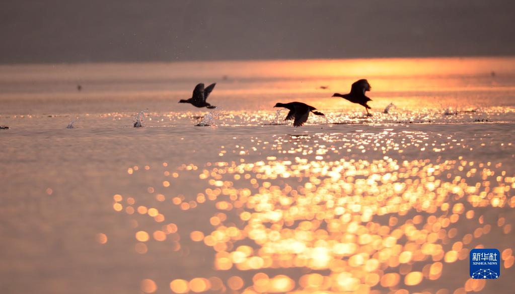 1月1日,在沂河山東省臨沂市郯城縣郯城街道段,水鳥沐浴在晨光里。
