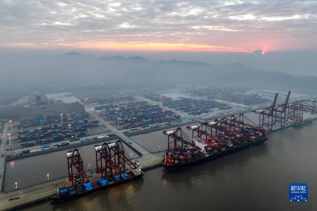1月1日清晨,集裝箱輪在寧波舟山港金塘港區大浦口集裝箱碼頭進行裝卸作業(無人機照片)。