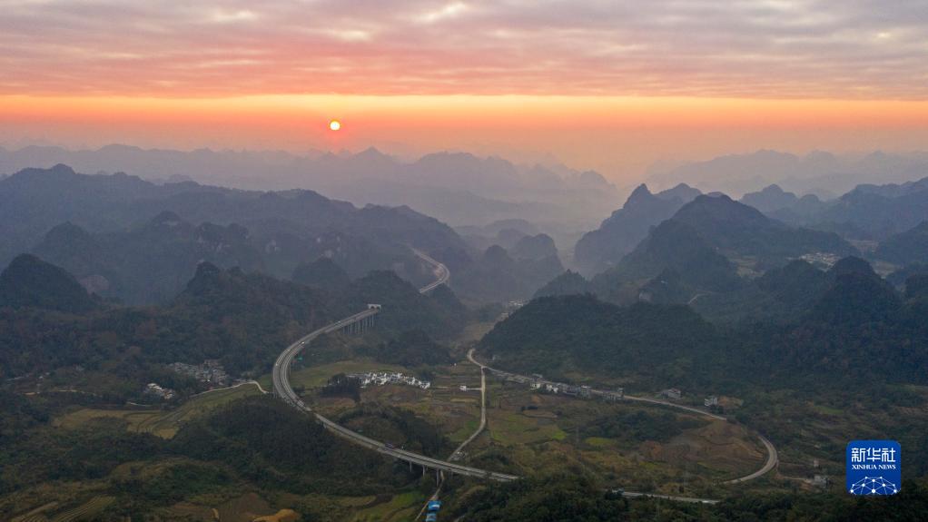 1月1日,廣西崇(左)靖(西)高速公路靖西市古龍山路段沐浴在新年晨光中(無人機照片)。