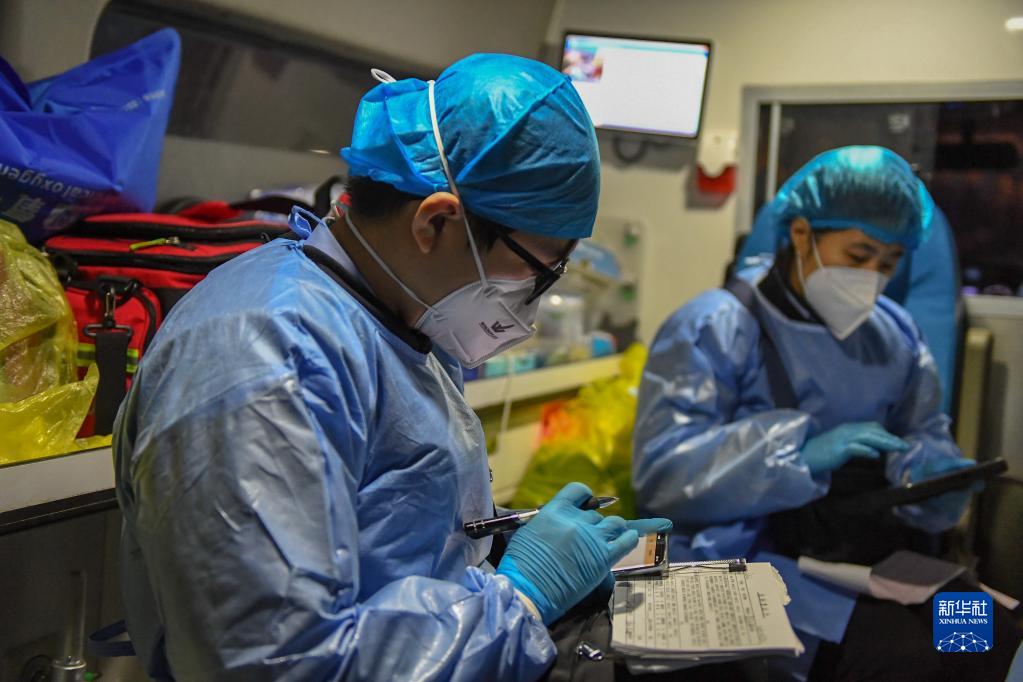 2022年12月31日,接到患者后,長春市急救中心富民大街急救站護士吳炳國(左)在救護車上登記患者信息。
