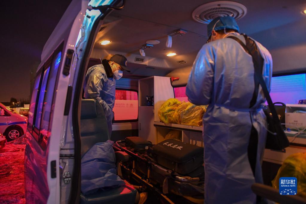 2022年12月31日,長春市急救中心富民大街急救站擔架員徐文超(左)、護士吳炳國整理裝備準備出車。