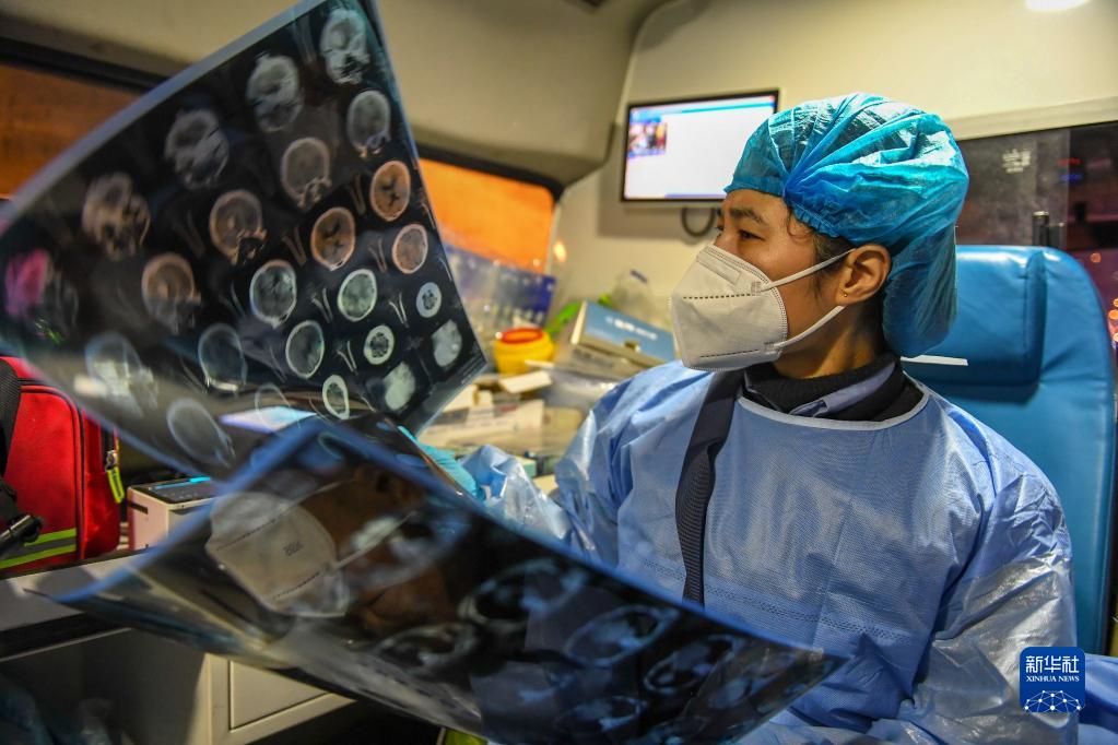 2023年1月1日,接到患者后,長春市急救中心富民大街急救站醫生李立群在救護車上查看患者過往影像檢查結果資料判斷病情。